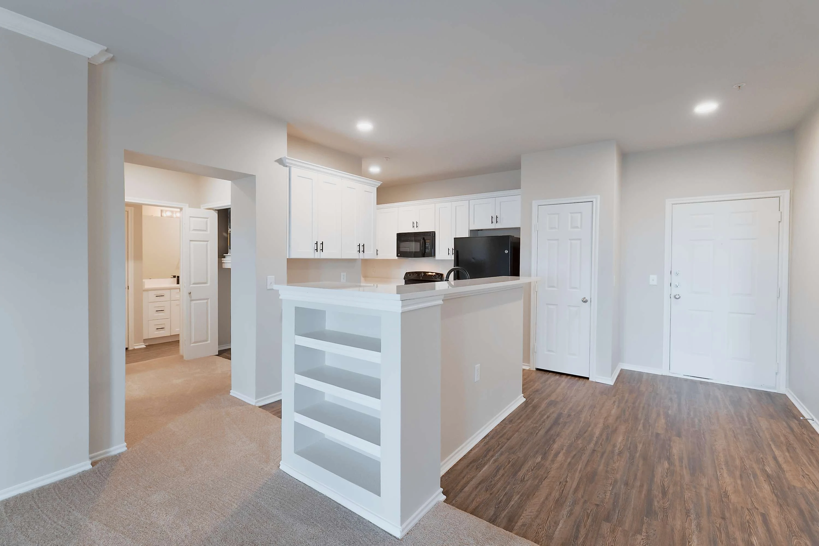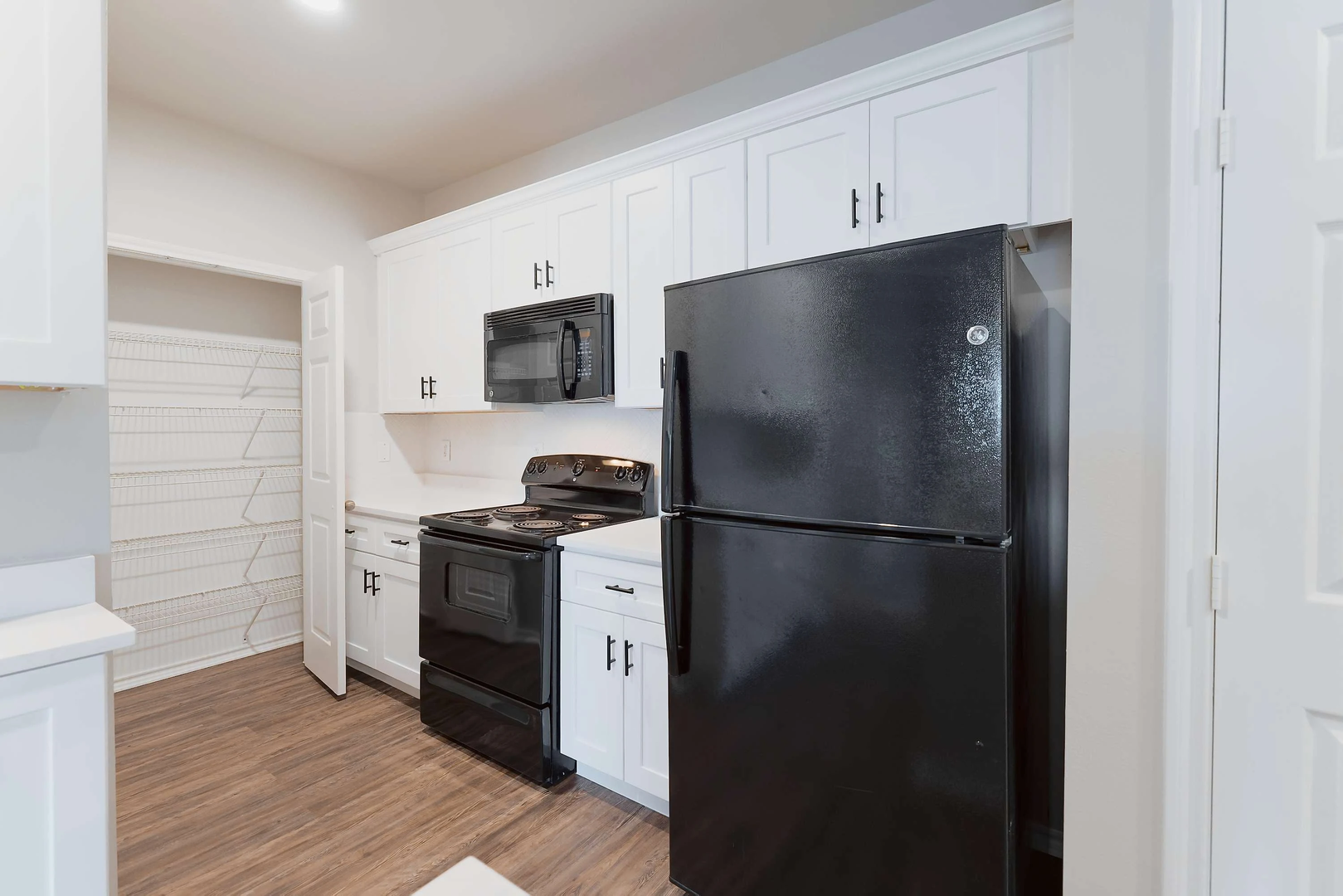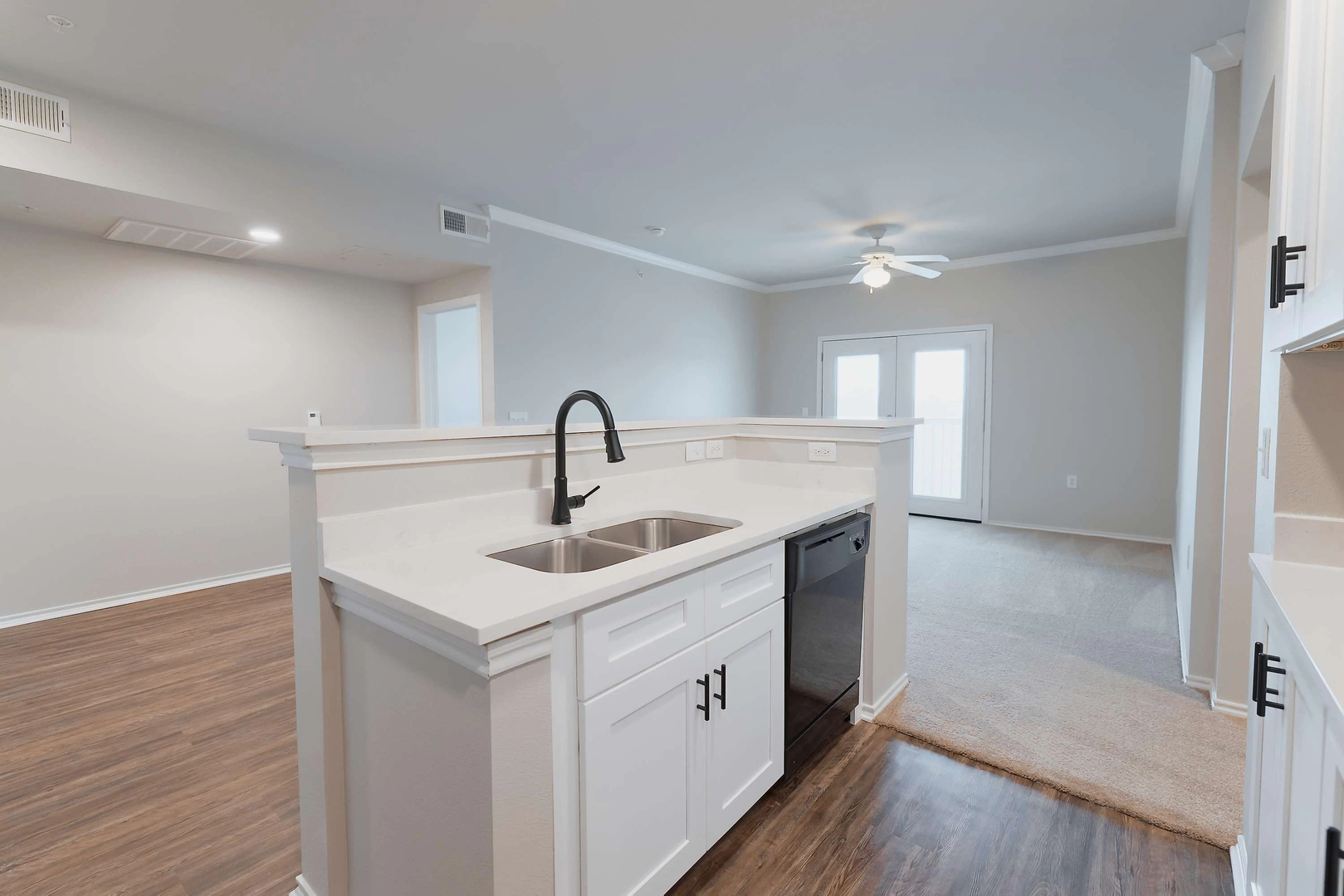 Experience the luxury of our newly remodeled two-bedroom, two-bathroom home, which covers 1,107 square feet. Featuring pristine white quartz countertops, a large island, stylish soft-close white cabinets, modern black appliances, and intricate black accents, this residence radiates elegance and opulence.