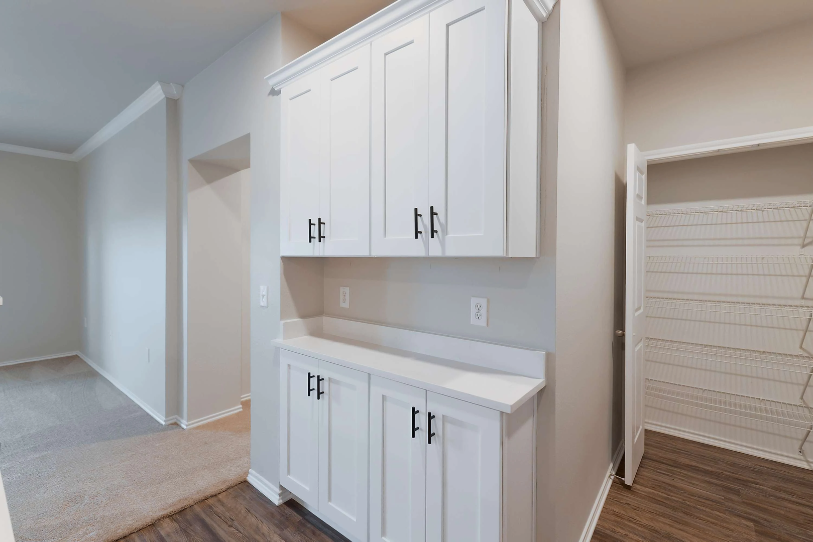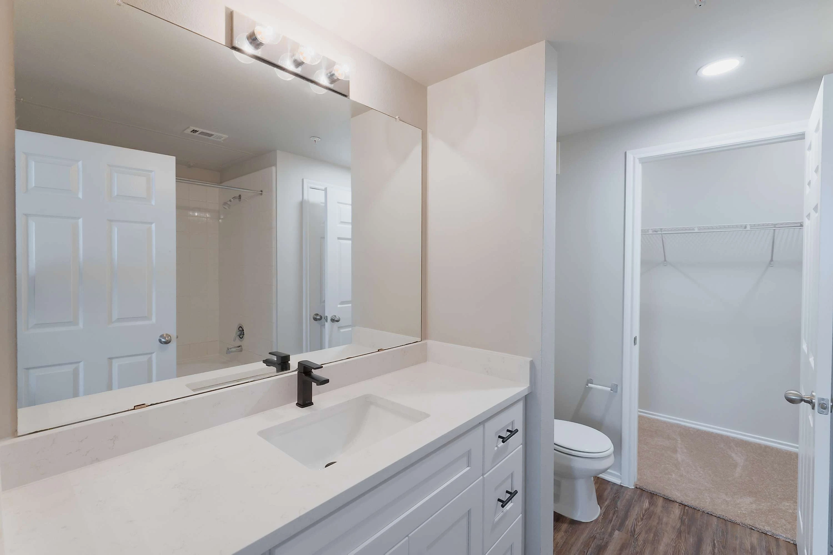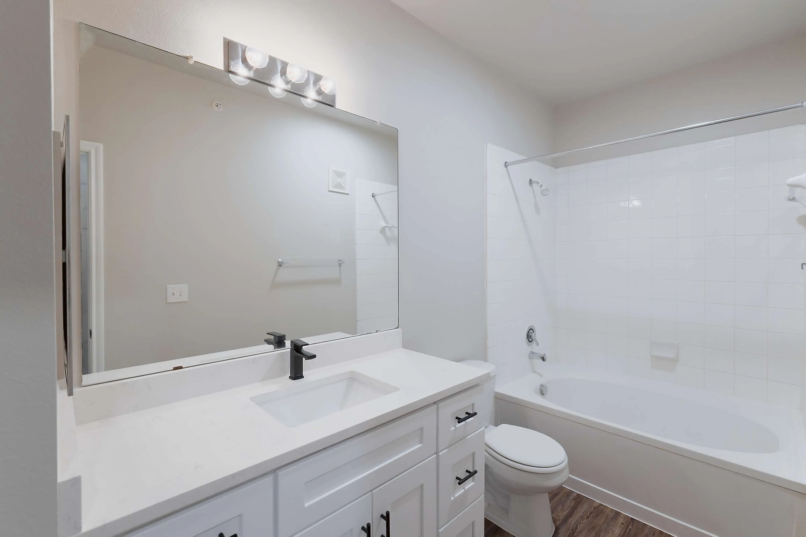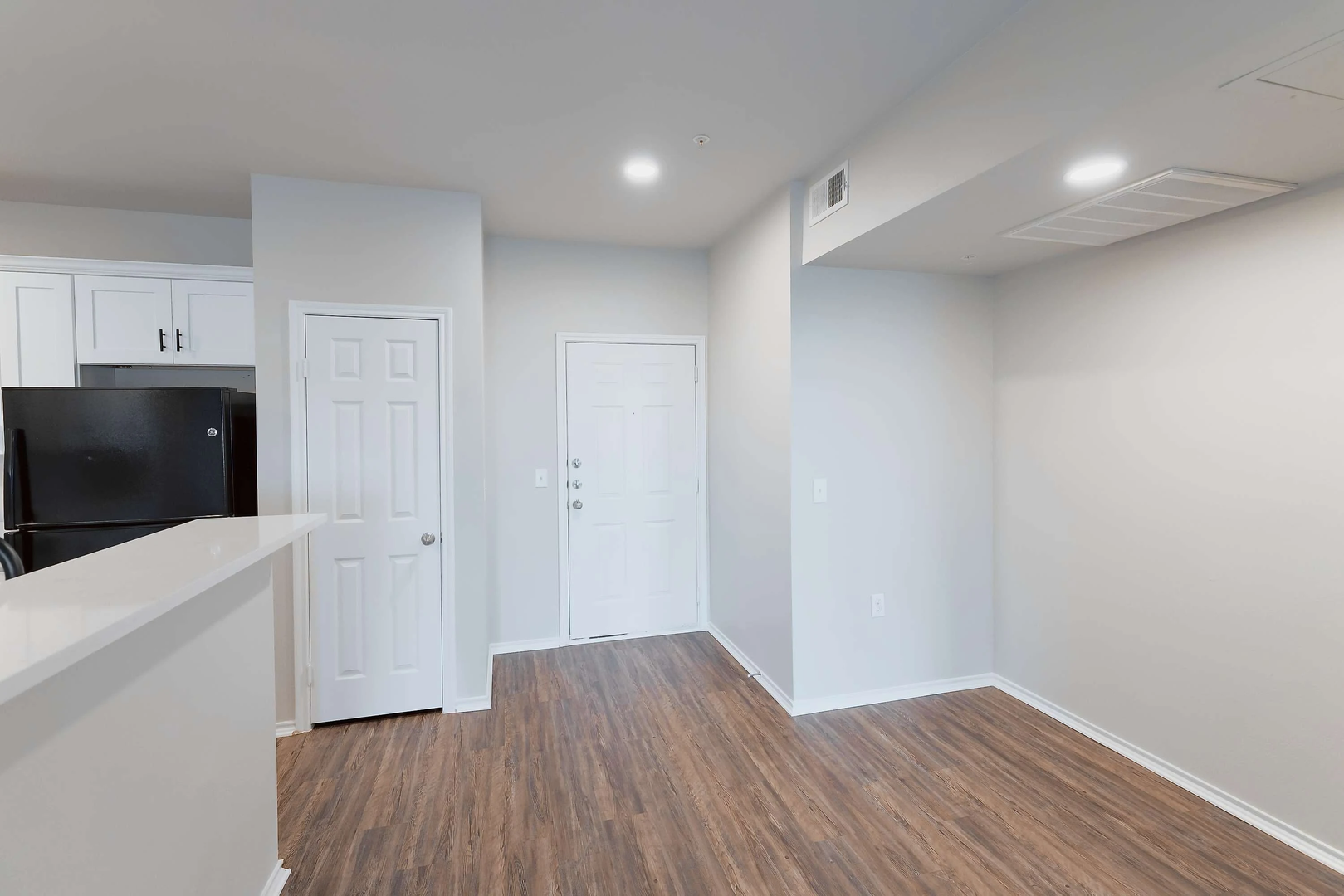 Experience the luxury of our newly remodeled two-bedroom, two-bathroom home, which covers 1,107 square feet. Featuring pristine white quartz countertops, a large island, stylish soft-close white cabinets, modern black appliances, and intricate black accents, this residence radiates elegance and opulence.