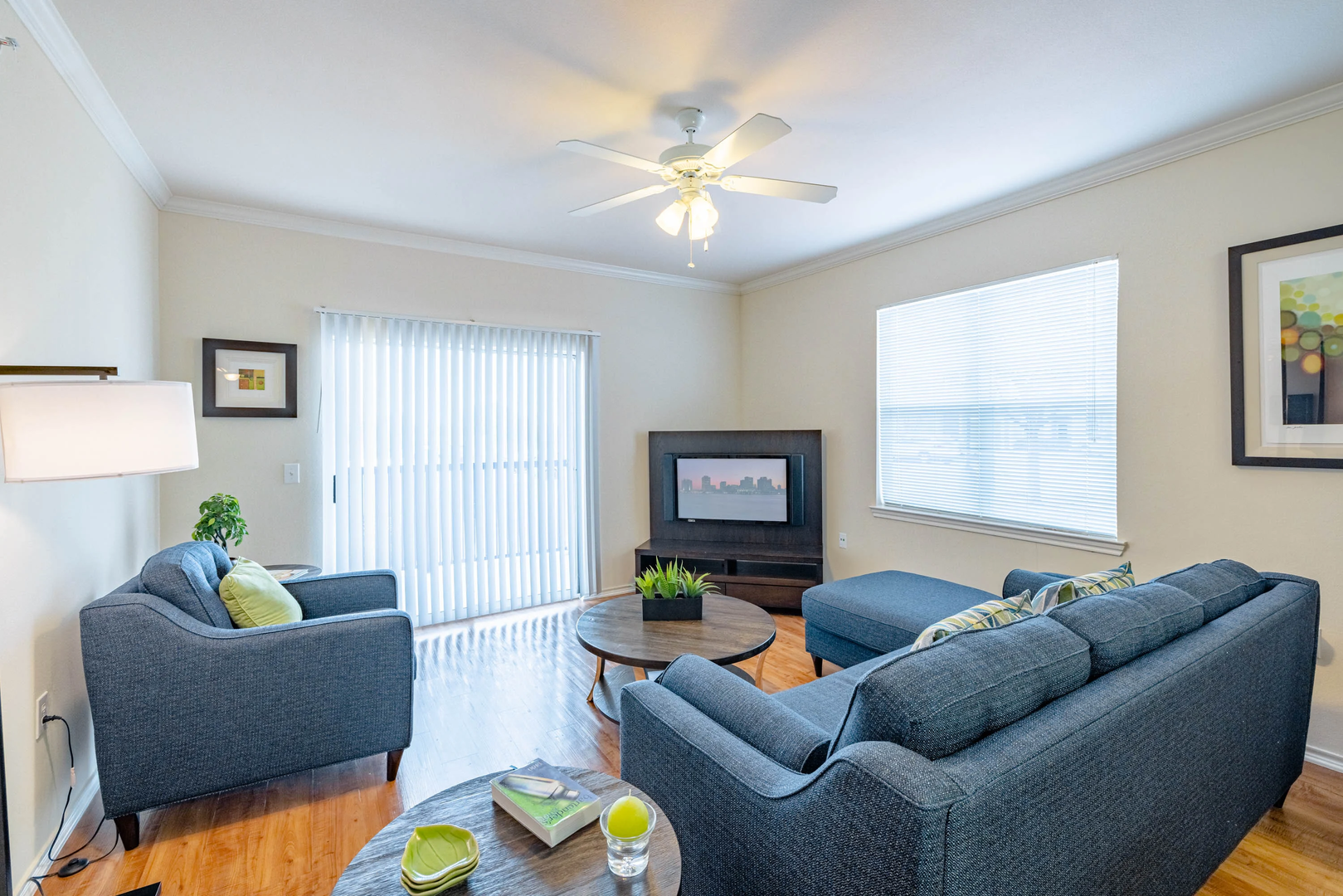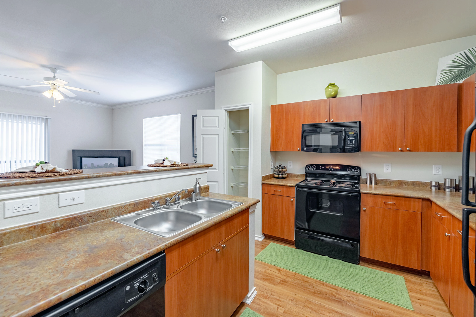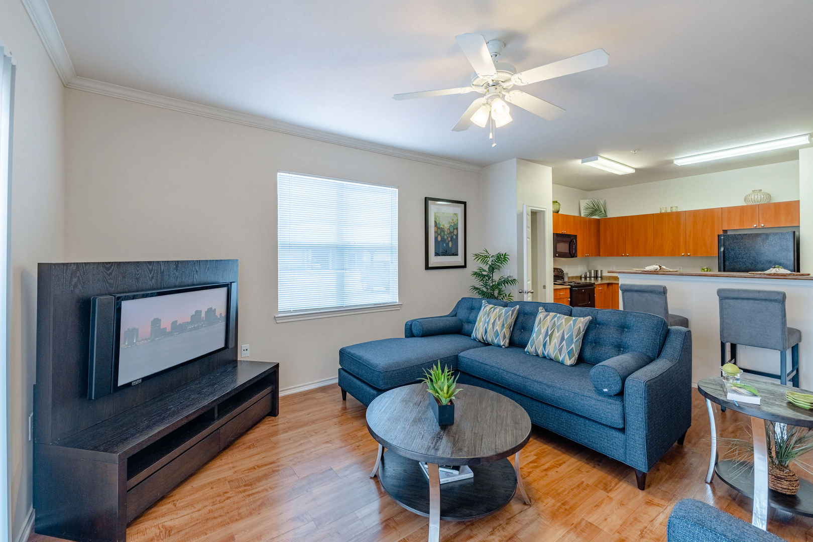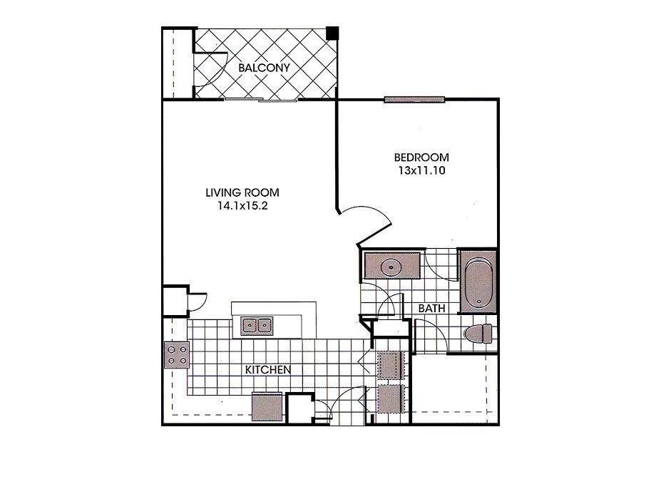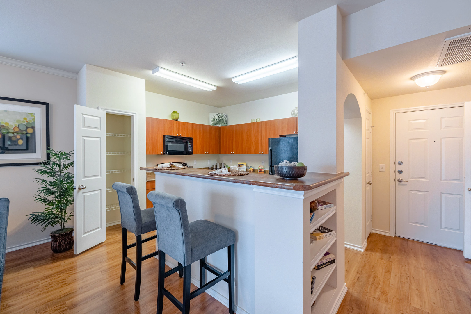 Explore our delightful one-bedroom, one-bathroom floor plan, featuring a spacious 756 square feet of cozy living area. This layout highlights stylish wood-style details, modern black appliances, built-in bookshelf for added convenience, and elegant crown molding for a touch of refinement.