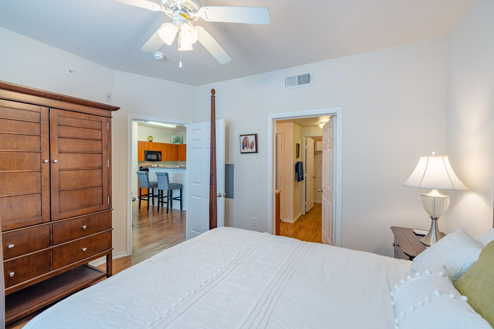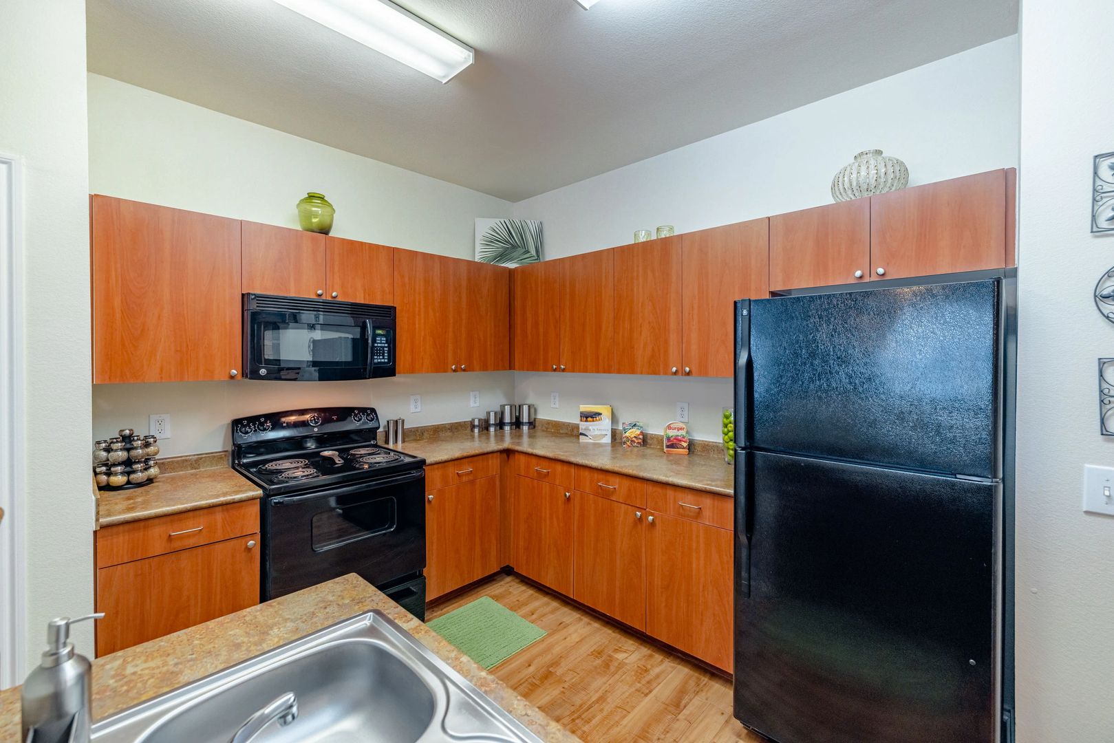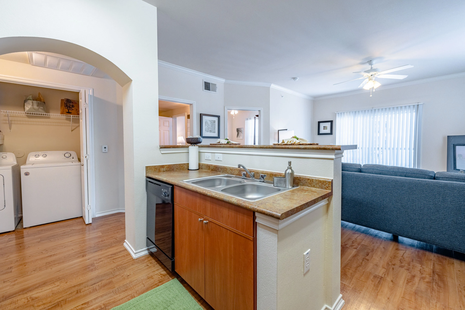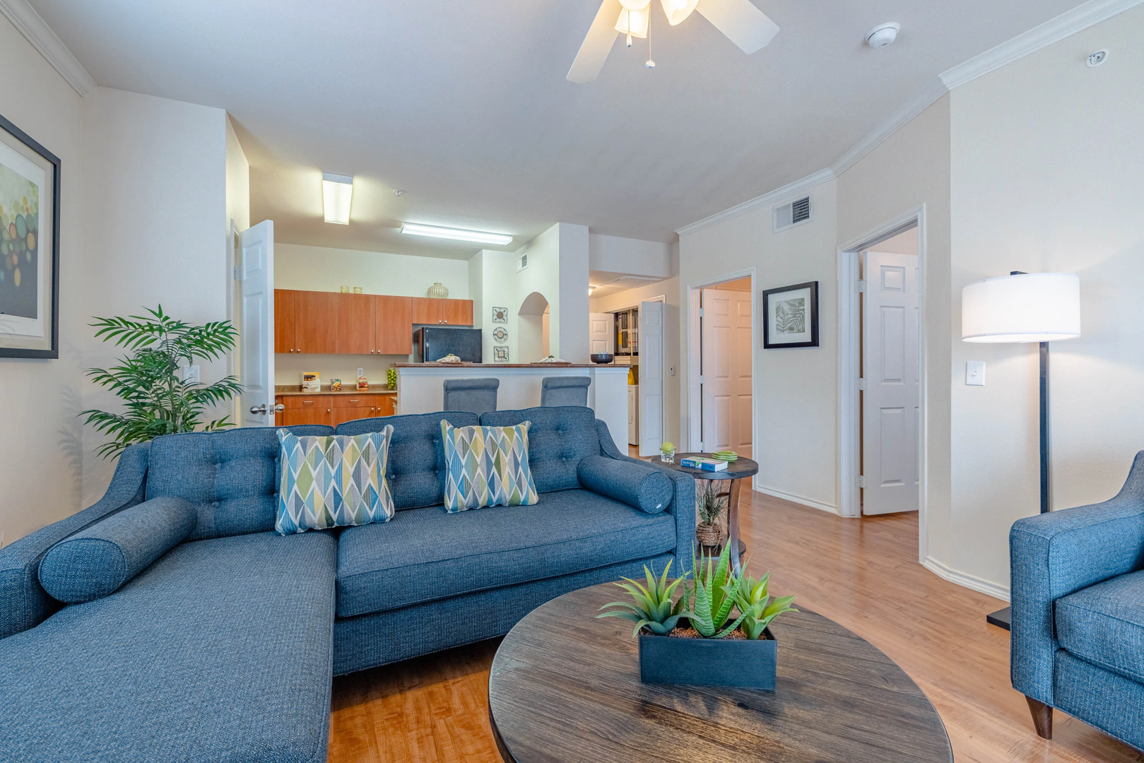 Explore our delightful one-bedroom, one-bathroom floor plan, featuring a spacious 756 square feet of cozy living area. This layout highlights stylish wood-style details, modern black appliances, built-in bookshelf for added convenience, and elegant crown molding for a touch of refinement.