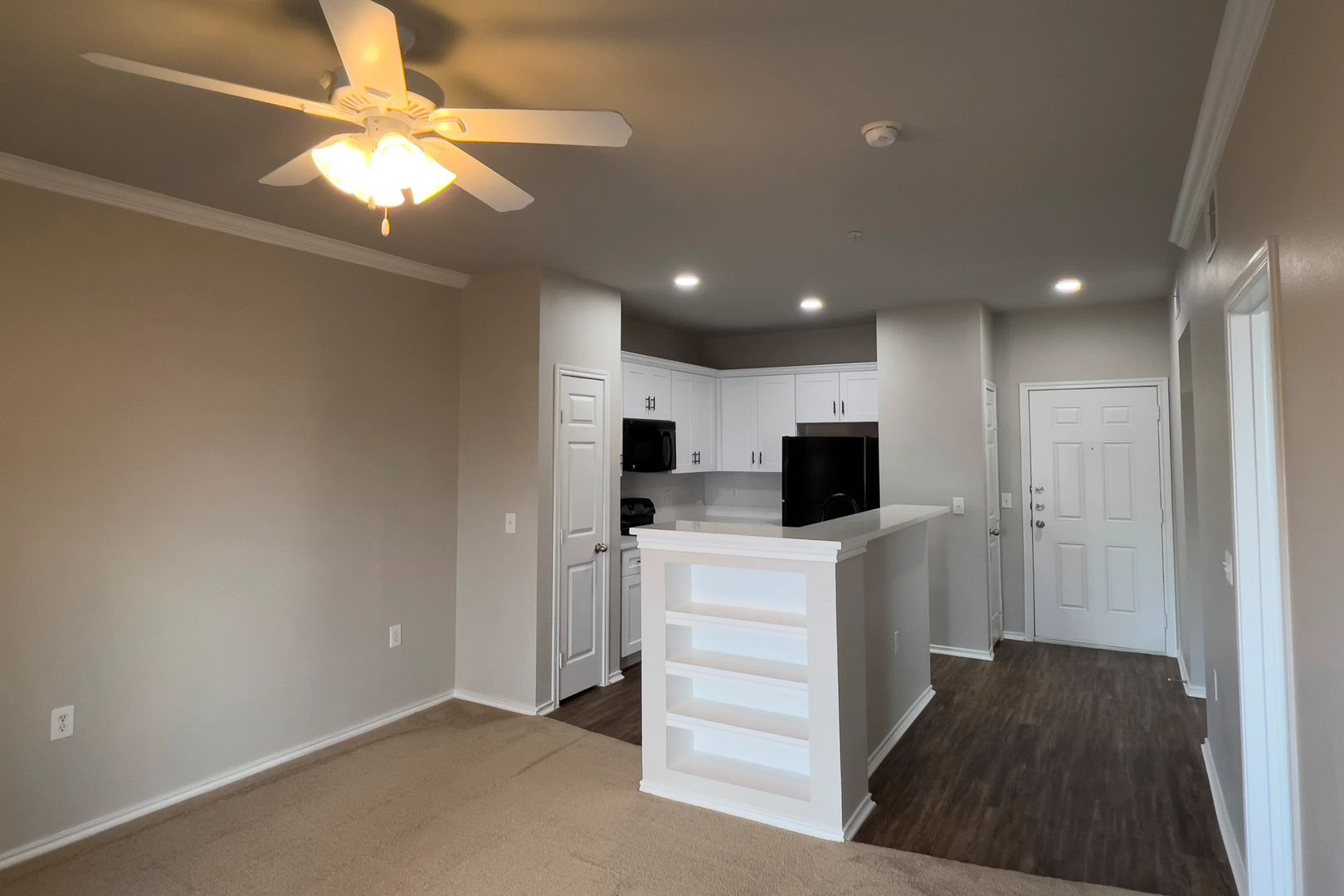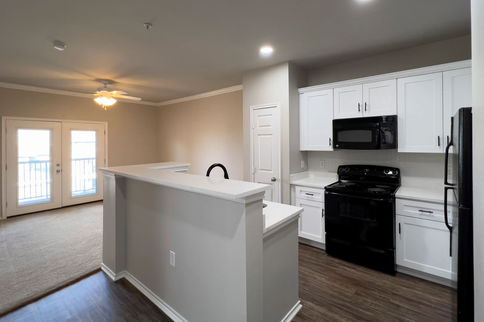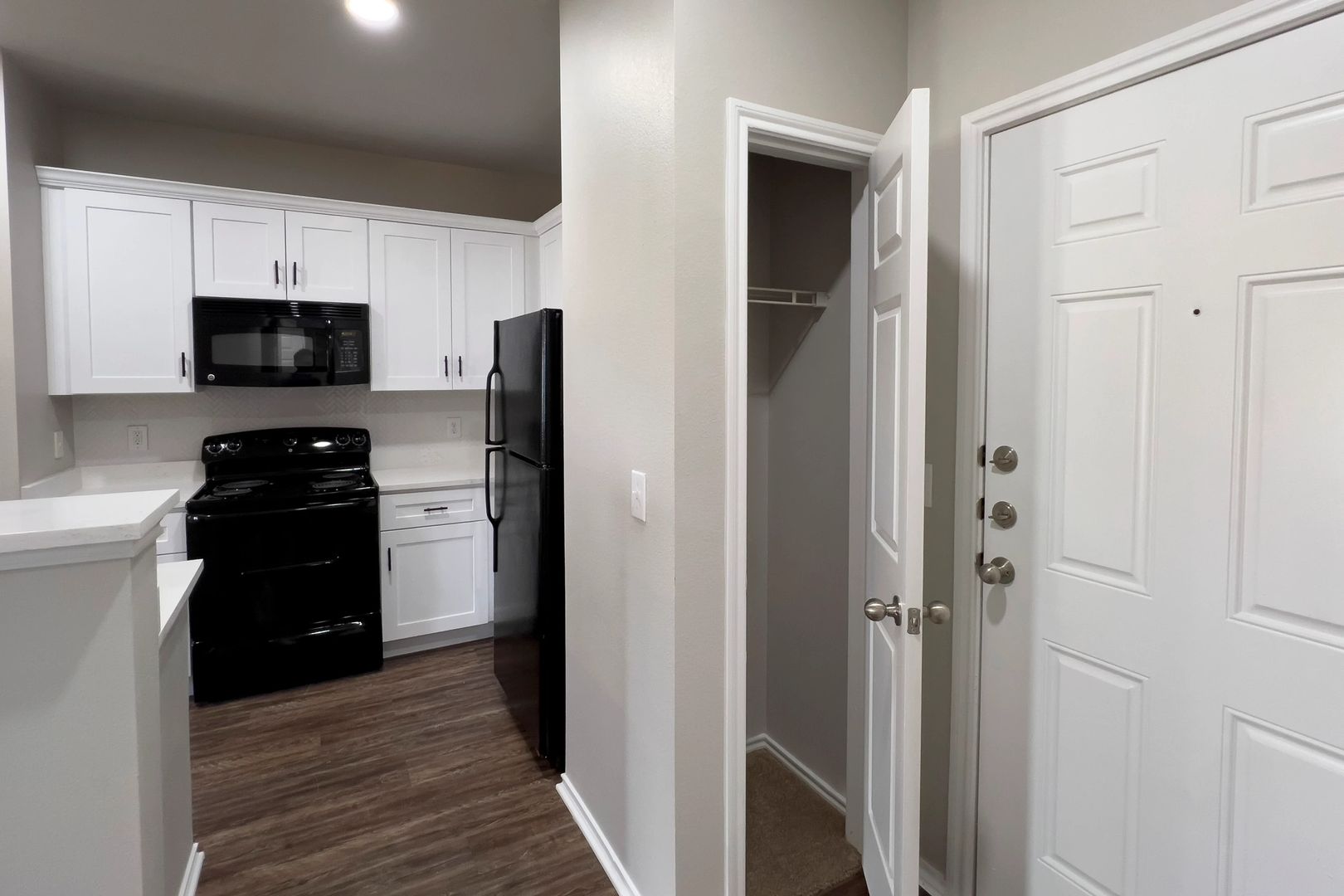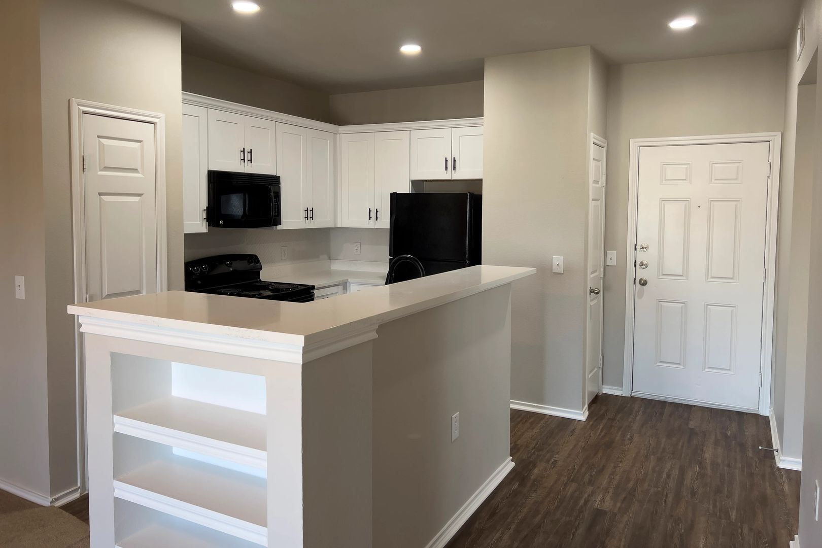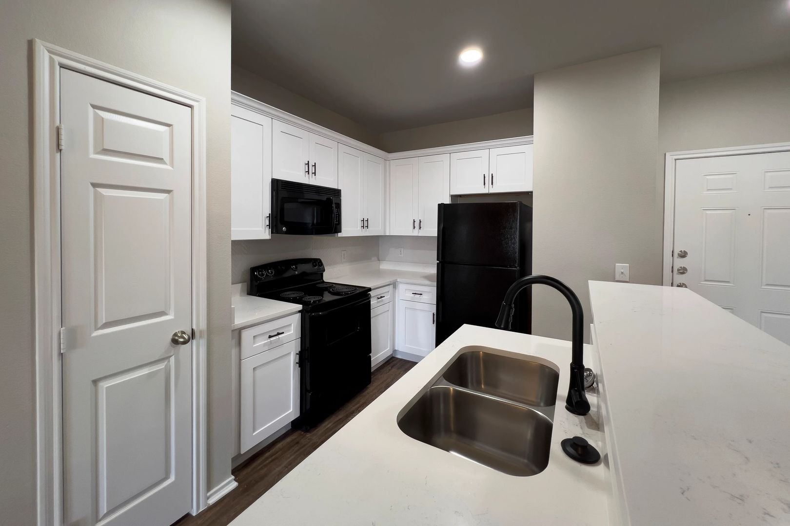 Luxuriously renovated one-bedroom, one-bathroom residence spanning 702 square feet. Featuring elegant white quartz countertops, a sleek island, pristine white soft-close cabinets, sophisticated black appliances, and exquisite black finishes for added refinement.